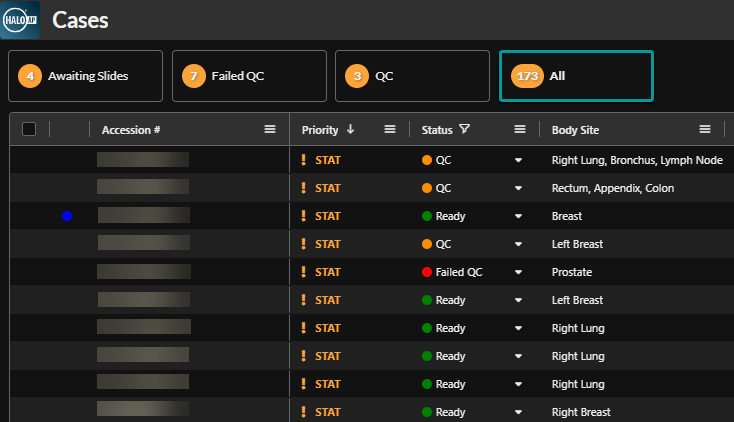 Within HALO AP®, SlideQC BF can automatically tag cases with slides meeting or exceeding a laboratory-defined artifact threshold for further review. Cases can then be triaged into separate worklists for automatic quality control workflows that determine ‘further review’ or ‘ready’ status.