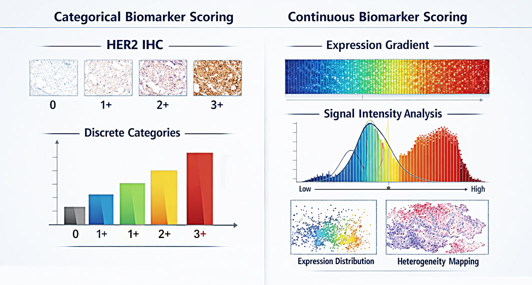 Traditional IHC scoring frameworks, such as the HER2 0/1+/2+/3+ system, were developed to simplify manual interpretation in the pre-digital era. While historically essential, this system falls short in the digital era; it defines arbitrary thresholds that impose artificial boundaries, causing category cut offs that have major implications on treatment eligibility, prognosis, and entry into a clinical trial. Additionally, inter-observer variability is particularly pronounced at category boundaries where concordance declines even among expert pathologists.