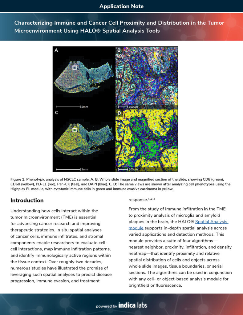 Download this application note to learn about the tools provided by the HALO Spatial Analysis module and how they are used to identify proximity and relative spatial distribution of cells and objects.